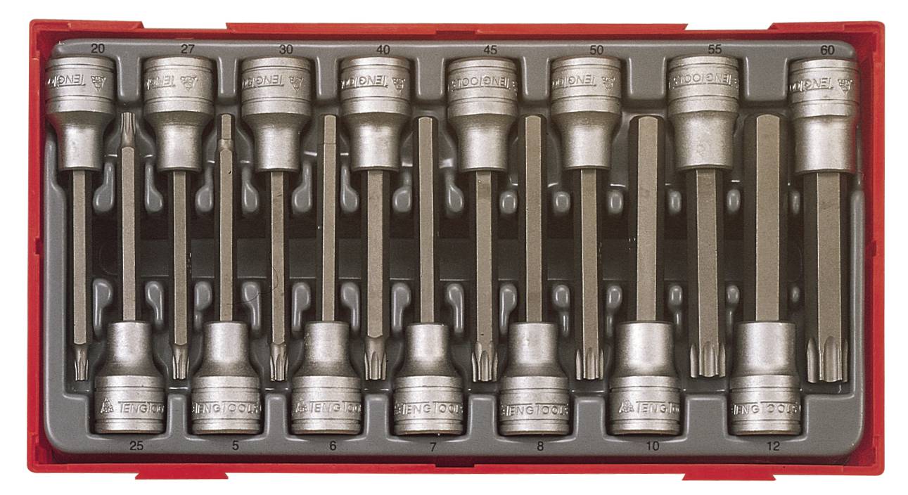 Sats bestående av 15 st 100 mm långa hylsbits, 9 st för invändiga TX-spår samt 6 st för invändiga sexkanthål, samtliga med 1/2” fyrkantsfäste. Mattförkromade.