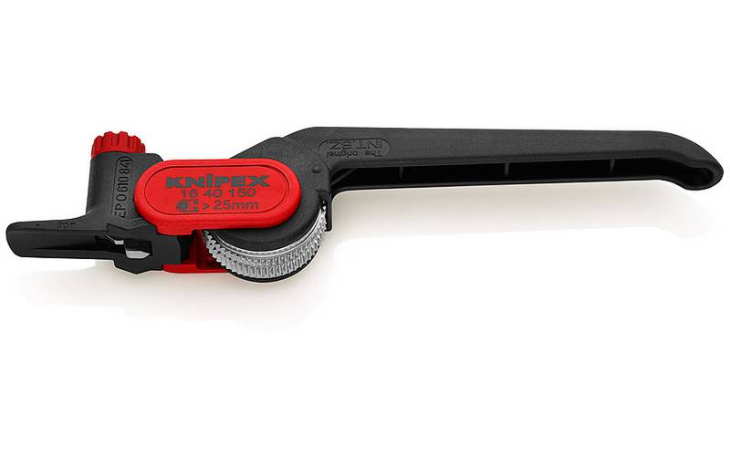 För avmantling av rundkabel med diameter över 25,0 mm. Avlägsnar alla mantlar på standardkablar. Passar för längdskärning och rundskärning. Skärdjupet kan justeras upp till 5.0 mm. Utbytbart blad (båda sidor kan användas). Verktygskropp: plast, glasfiberförstärkt.