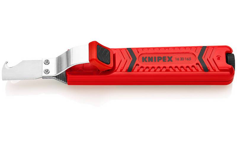 För skalning av vanlig rundkabel. Självspännande fästbygel. Med justerskruv för skärdjupsinställning. Vändbart blad för periferi- och längdskärning. Reservblad inuti handtaget. Säkert grepp tack vare mjukt material i handtag och fästbygel som förhindrar att du tappar greppet (hölje av slagtålig plast). 190532200 – Med kniv och krokblad, skyddslock ingår.