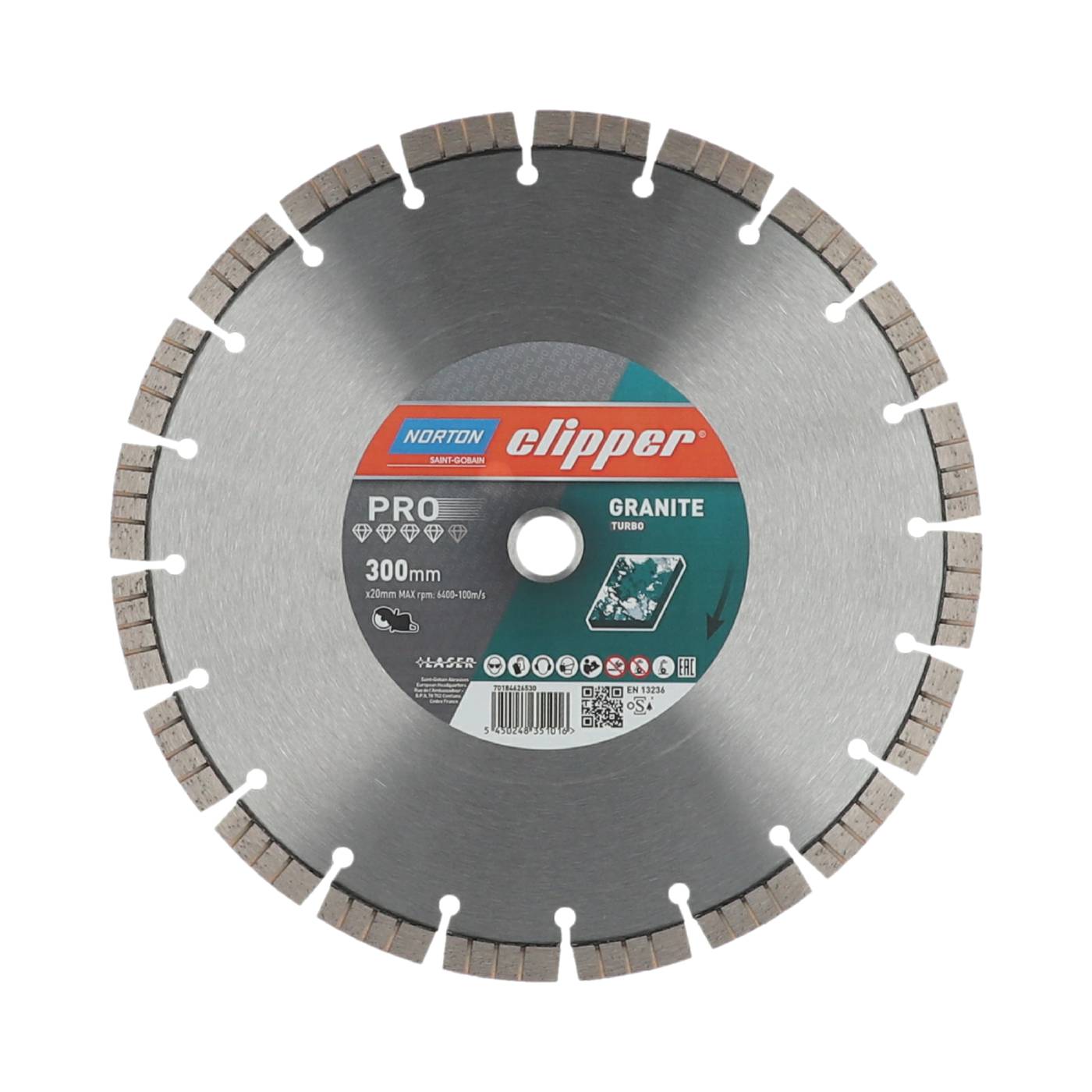 Diamantkapklinga Norton Clipper Pro Granite Turbo för handhållna bensindriven kapmaskin, vinkelslipmaskin, bordsåg. Lasersvetsad klinga för våt- eller torrkapning med mycket bra prestandaförhållande. De 12 mm höga segmenten ger mycket lång livslängd och det korrugerade stambladet ger mindre friktion och mycket snabb kapning särskilt i granit och annan hård sten. För granit, hård beläggningssten, skiffer,betongplattor.