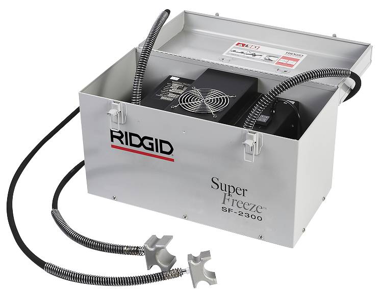 Frysmaskin SF-2300. Utrustad med SF-2300 SuperFreeze-enhet, fryshuvud med 18-28-42 mm håligheter, sats med 2 st 12/15/22/35 mm insatser för rör i koppar och stål, sats med 2 Velcro-kardborrband, 1 fästprofil, 1 sprayflaska och 1 flaska frysgel (237 ml)
