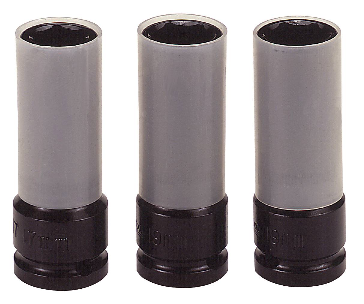 Sats om 3 1/2” hylsor av krommolybdenstål. För dragning av hjulmuttrar. Försedda med skyddshylsa som skyddar vid användning på aluminiumfälgar.