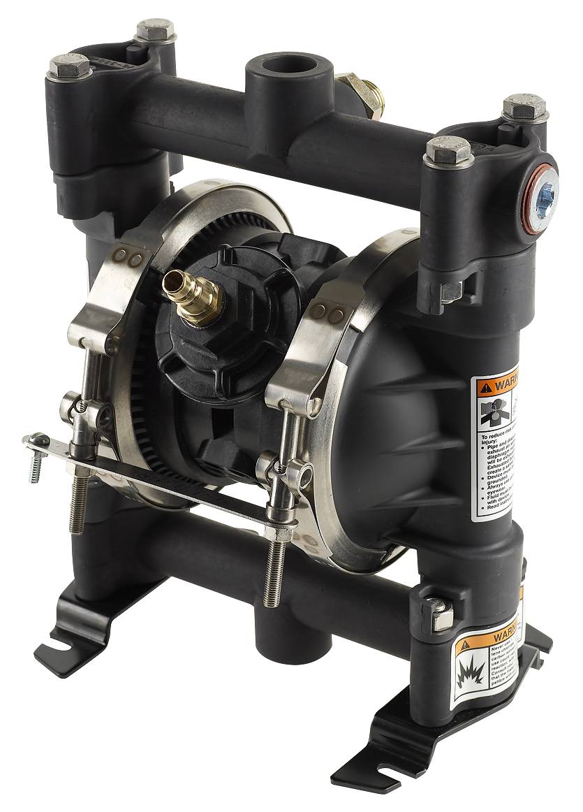 Pneumatisk självsugande membranpump för vätskor. Pumphuset är tillverkat av PP. Membran och ventilkäglor tillverkade av PTFE samt PP. 28450104 har oringar i PTFE, 28450203, 28450302, har oringar i FPM.