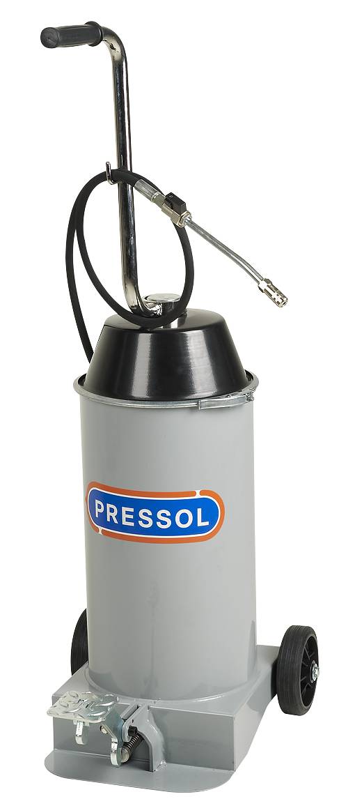 Mobil fettpump där fettet pumpas fram med fotpump. Används där större mängder fett erfodras. För fetter upp till klass 2. Med 15 kg behållare och fasta hjul. Fylles manuellt.