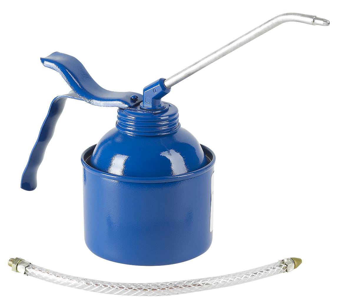 Standardversion. Tryckpump av mässing. Med behållare av helpressad plåt. Utbytbara pipar. Lackerade – blå. Med fast och böjlig pip.