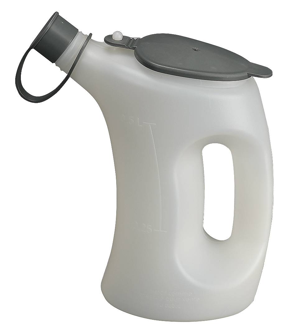 Oljemått med lock. Transparent. Av polyetylen. Med mängdskala på sidan. Olje-, syra- och bränslebeständig. Okrossbar. Användbar i temperaturer från -10° till +110°C.