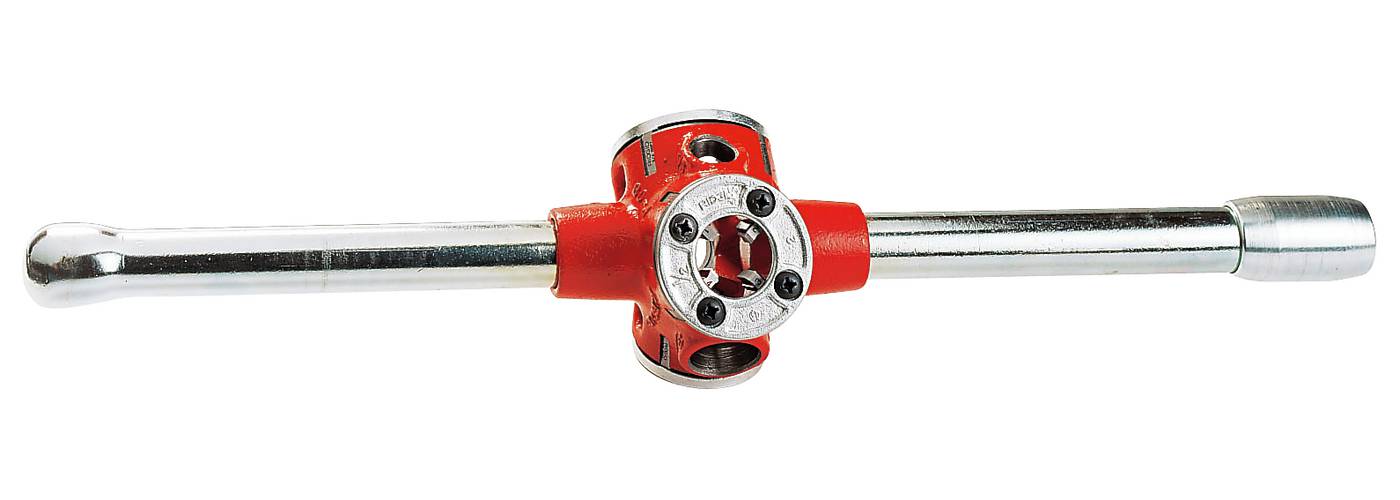 Tre-vägskloppa. Med gängbackar av specialstål. Vändbara gängbackar för gängning av kort utskjutande rörändar.