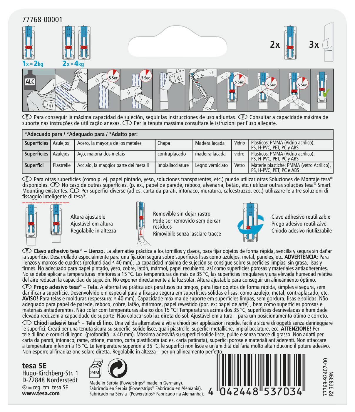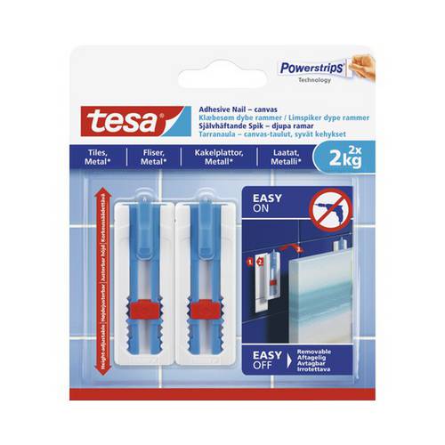 Tesa självhäftande spik är ett mycket smart alternativ till konventionell spik när du ska hänga upp tavlor eller andra lättare föremål.Tack vare Powerstrips®-tekniken fäster du spiken enkelt på släta ytor som kakel eller metall och tar bort den utan att den lämnar spår – och den går att använda igen med en ny självhäftande remsa. Du kan också justera spikens höjd när som helst för att rikta in prydnadsföremålet perfekt. Max. bärförmåga per självhäftande spik är 2 kg. Den självhäftande spikens metallspets säkerställer säker fastsättning av tavlan.