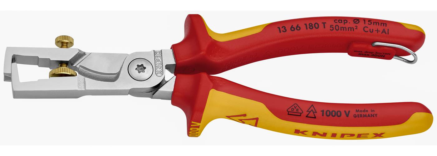 Med isolering enligt IEC 60900 för arbete under spänning upp till 1000 volt (av speciellt utbildad personal). Enkel led. Med ställskruv för önskad tråddiameter upp till 5 mm. Med fjäder. Med kabelsax. Förkromad. Med inbyggd fästögla för infästning av fallsäkringslina.