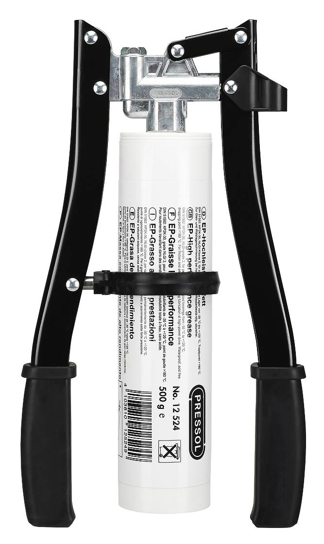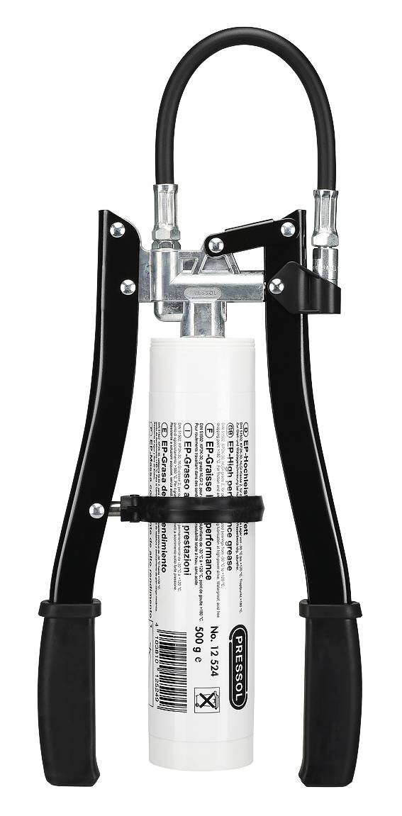 Tvåhandsmanövrerad högtrycksspruta anpassad för 500 g skarvpatron. Smörjtryck 40 MPa (400 kp/cm³). Anslutningsgänga M10x1.