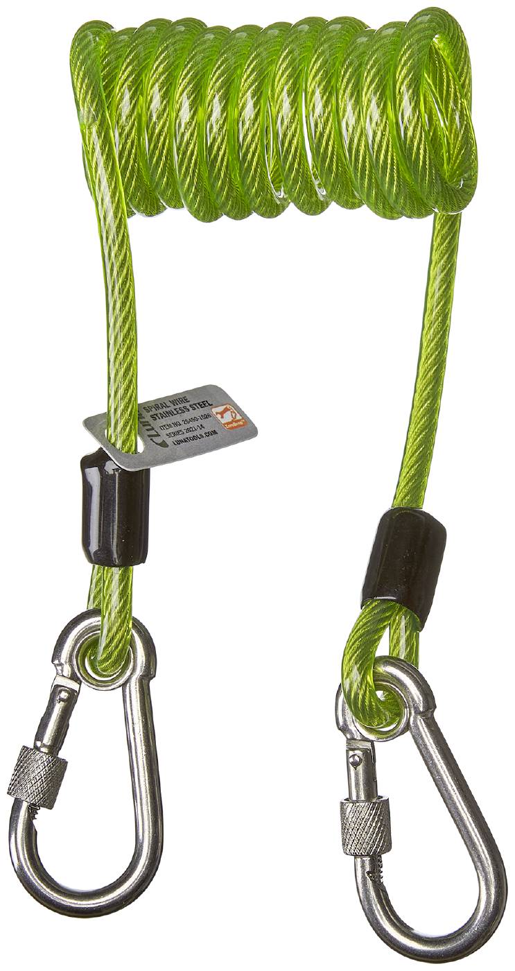 Spiralwire av rostfritt stål (AISI 304) med plastskydd, karbinhakar i rostfritt stål (AISI 304) med skruvlås.